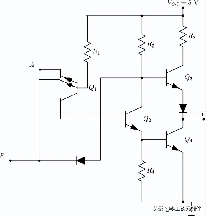 下面为标准TTL逻辑门的电路图,正 NAND 门功能,如下图所示。这种标准的TTL逻辑电路在某些情况下与二极管-晶体管逻辑(DTL)电路有关。