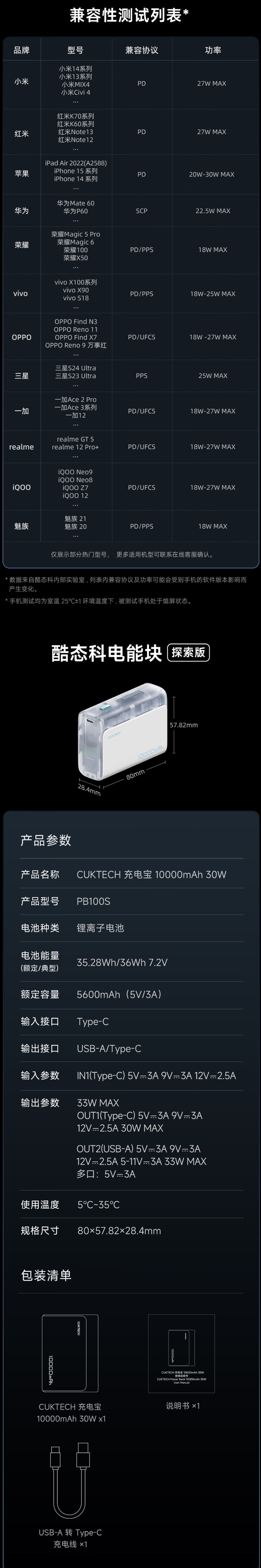 酷态科电能块探索版拥有 10000mAh 容量(36Wh 可上飞机),双向 30W MAX 快充,支持 1A1C 双口同充,号称 iPhone 15 手机 30 分钟充电约 58%,USB-A 口兼容 UFCS 融合快充,以及华为 22.5W 快充。