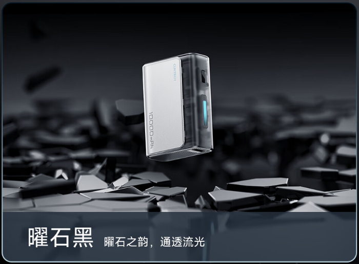 该充电宝平面尺寸为 80×57.82×28.4mm,平面尺寸类似银行卡大小,重量约 195g,采用微光半透上壳、脉冲星轨灯带。