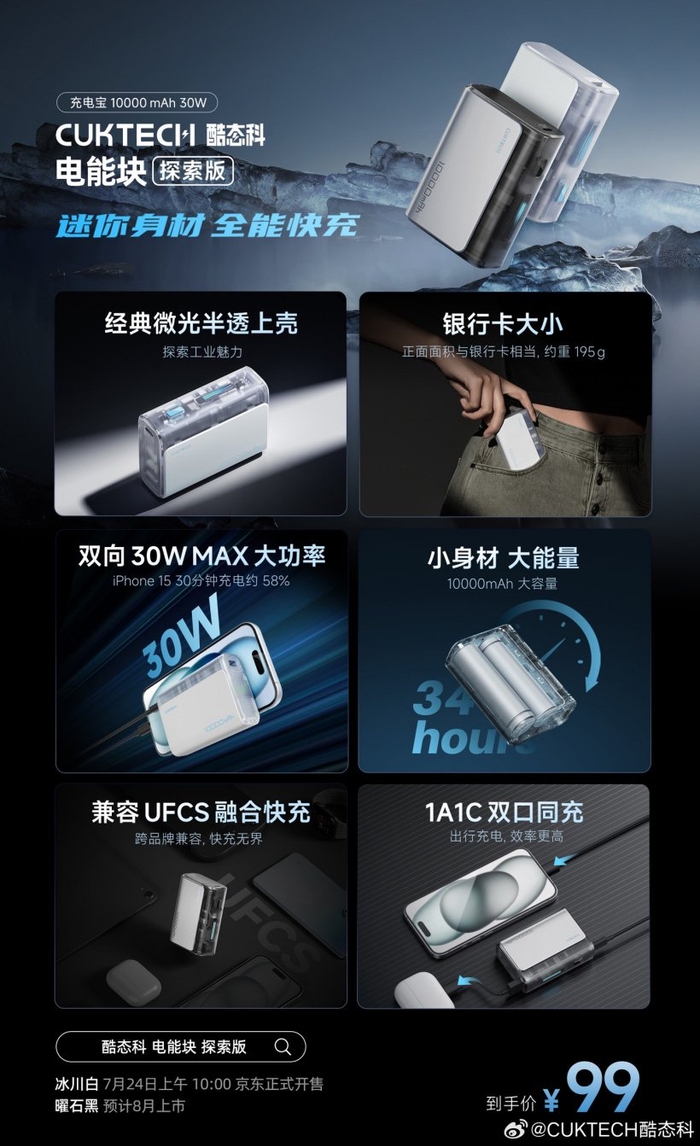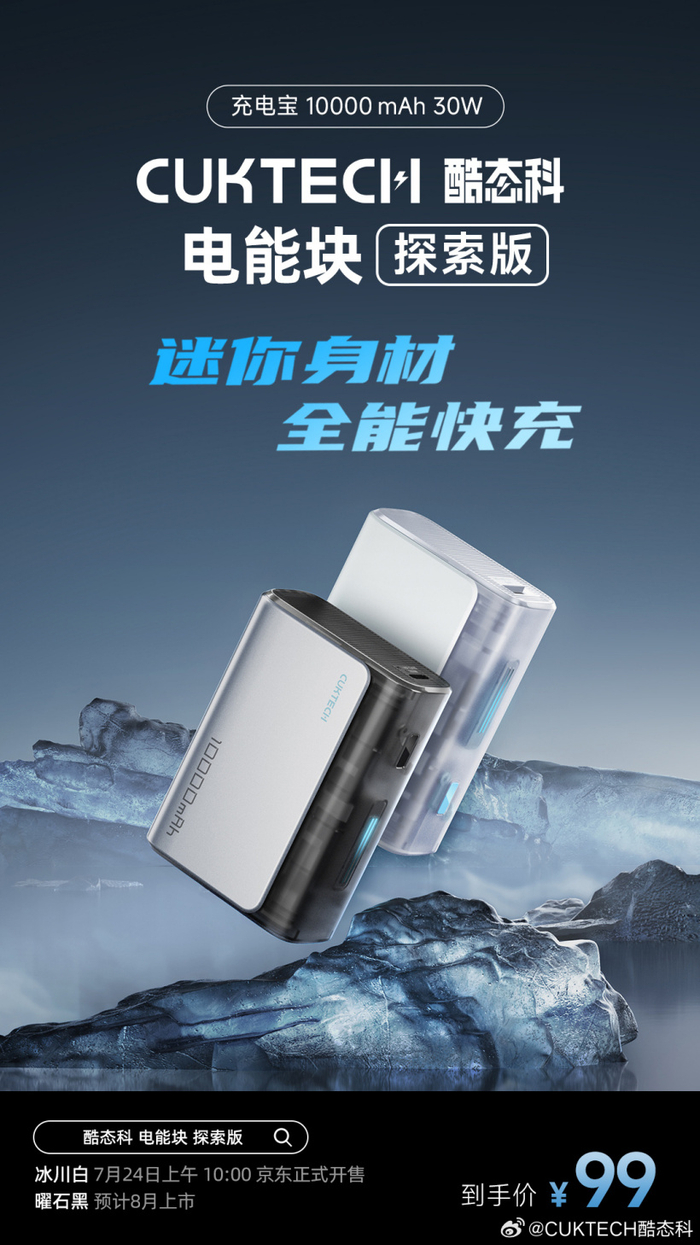 酷态科电能块探索版充电宝现已发售,首发价 99 元,冰川白配色今日 10 点开售,曜石黑预计 8 月上市,IT之家附参数表如下: