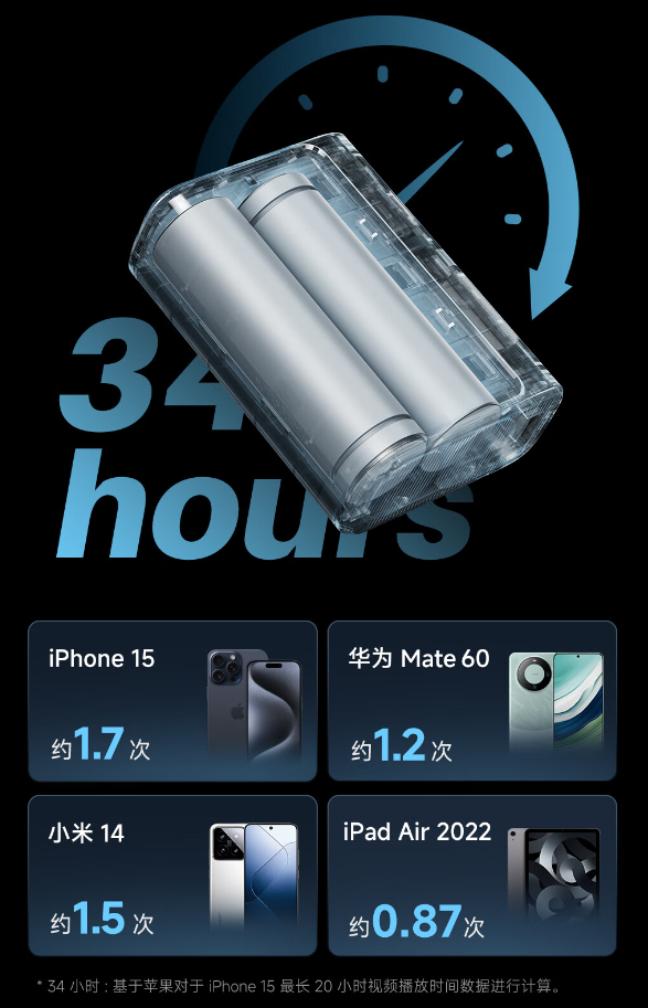 该充电宝内置 2 颗 21700 动力电芯,官方宣称 1000 次循环测试电池容量仍然大于等于 70%,还有 9 重防护措施。