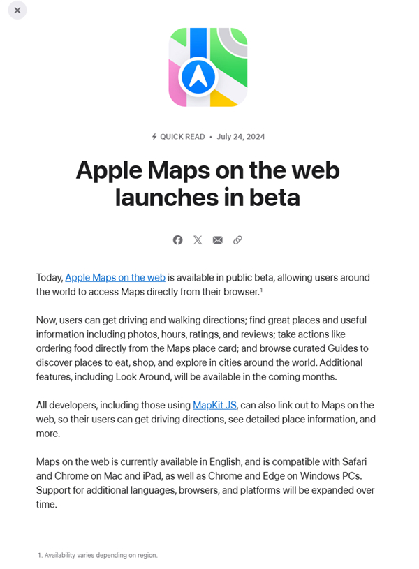 苹果推出Apple Maps网页版地图:兼容Win PC Chrome、Edge浏览器