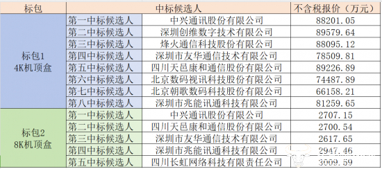 从公告信息来看,中兴通讯以88201.05万元、2707.15万元的不含税报价成功拿下标包1和标包2的第一中标候选人之位,成为当之无愧的项目最大赢家。深圳创维数字技术、烽火通信分别是标包1的第二、第三中标候选人,收获也不小。而深圳市友华通信、四川天邑康和通信、深圳市兆能讯通均在两个标包中拿下一定的份额。