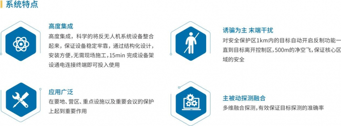 以雷达为核心的有源探测单元,实现了所有飞行目标的探测,配合导航诱骗与电磁干扰手段,对目标进行分级防控,对安全保护区1km以内的目标自动开启反制功能直到目标离开保护区,充分的保障核心区域的安全。