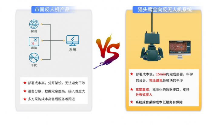 “猫头鹰反无人机系统”高度集成了雷达/频谱探测、GPS诱骗以及电磁干扰,采用模块一体化设计,形成一个系统+多维数据综合分析,不仅有效保证目标探测的准确率,而且安装便捷、无需现场施工调试15分钟完成架设使用。