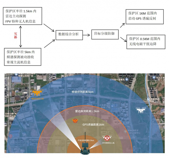 武汉雷可达科技有限公司自主研制的高集成一体化产品——猫头鹰全向反无人机系统,通过结合雷达/频谱探测、GPS诱骗、无线电磁干扰、数据分析、自动反制等手段,实现对无人机的监测、识别和打击。