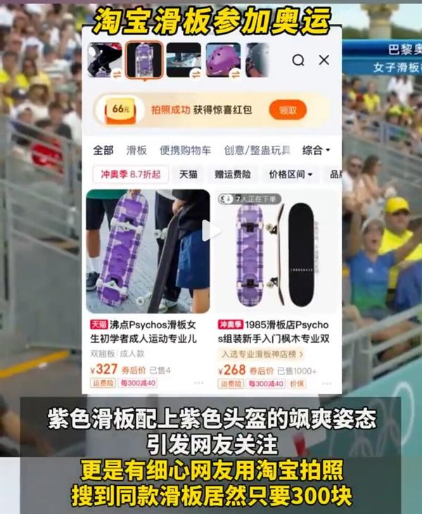紫色滑板配上紫色头盔的飒爽姿态引发网友关注,更是有细心网友发现,同款滑板在淘宝只要300块。