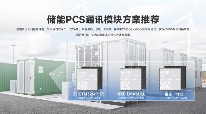 米尔嵌入式处理器模组在新能源行业主要在能量管理系统EMS、储能变流器PCS、电池管理系统BMS、逆变器数据采集器、新能源充电桩等产品上应用。