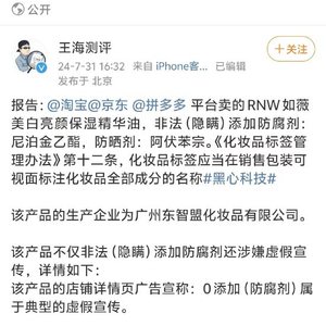 新浪科技讯 7月31日下午消息,职业打假人王海发布微博表示,@淘宝@京东 @拼多多 平台卖的RNW如薇美白亮颜保湿精华油,非法(隐瞒)添加防腐剂:尼泊金乙酯,防晒剂:阿伏苯宗。