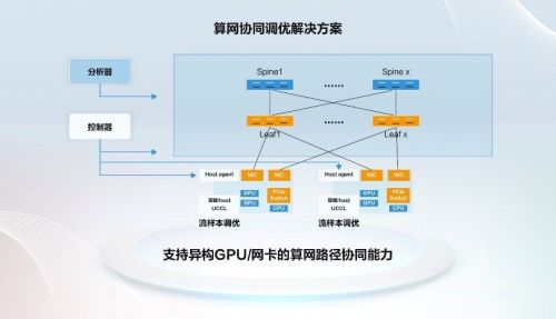 第二,通过将通信库、网络控制器、网络分析器结合起来,实现算网协同调度,如下图所示: