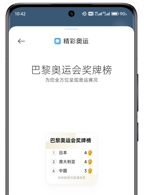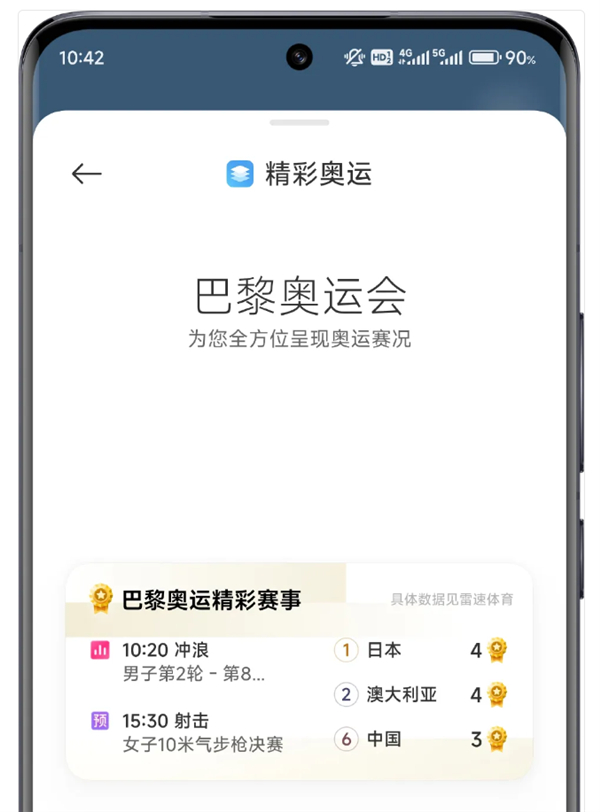 据介绍,奥运会精彩赛事小部件可以快速点击查看奥运会赛程和奖牌前三名的实时排名,点击即可跳转至对应内容。