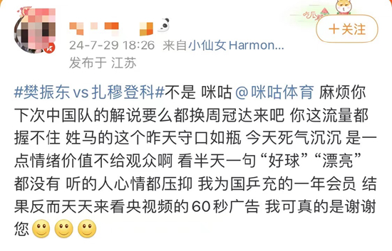 不止女篮赛事,在樊振东vs扎穆登科的比赛中,解说员马行飞也被一众网友吐槽称,他的解说守口如瓶、死气沉沉,并没有给观众情绪价值,“我为国乒充的一年咪咕会员,结果还要去看央视频的60秒广告。”