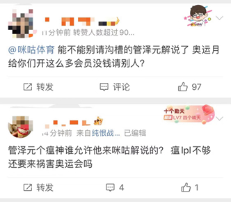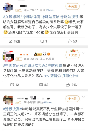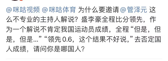在奥运的篮球、射击、乒乓球滑板等赛事中,咪咕解说员因“阴阳”球员化妆、解说守口如瓶、不肯定中国运动员成绩等被屡屡被骂上热搜。