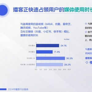 益普索中国区CMO向征在近日举行的《报告》线下分享会上提到,"由于播客的强粘性及强陪伴感的属性,用户正在将更多注意力时间挪到播客上。"