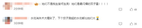 有网友看后表示:“水花消失术太精彩了,下个饺子溅起的水花都比她们大”“她们不是既生瑜何生亮,她们是最闪耀的双子星”。