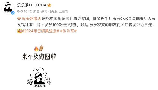 还有一个以小搏大的例子是乐乐茶。随着潘展乐上演惊天逆袭,“乐乐家族”一词登上热搜,网友喊话乐乐茶为何不找潘展乐代言?乐乐茶紧接着就跟进发放1000张奶茶券,虽然没有直接点名潘展乐,却完成了流量的承接,用小成本赚足了人气。
