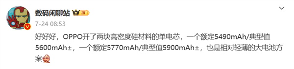 据博主此前透露,OPPO Find X8系列全系标配高密度硅材料大电池,标准版电池容量为5600mAh,Pro版电池容量为5900mAh。
