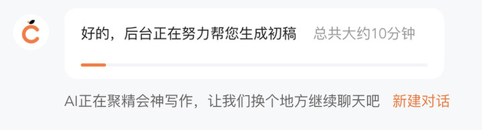 然后就可以生成正文了,耗时大约 10 分钟,橙篇贴心地提醒我们不必干等,可以开新的聊天窗口,做些别的事情。对话历史和文件都会保留,不怕关上网页就丢失。