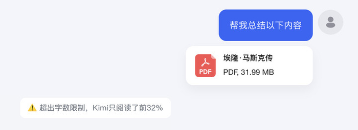 将相同的文件丢给 kimi 总结,超出字数限制,只读了前 32%,效果不免大打折扣,也不能进行下一步了。不过,两者是两个场景的产品,体验上的差异也可以理解。