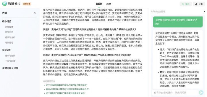 元宝的总结形式更加创新,拆解了核心信息,要点的呈现又更加结构化,按研究背景、研究方法、研究结果娓娓道来,我们还可以在一侧继续追问。
