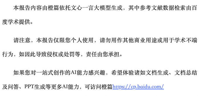 正文最后默认加了个声明,橙篇基于文心一言模型,参考文献来自百度学术。橙篇本来就是百度文库的产品,这属于发挥自身优势,就像腾讯元宝基于公众号生态。