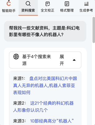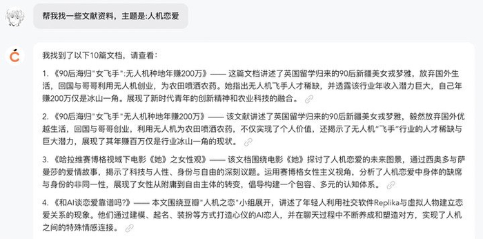 先试试「学术搜索」,输入「人机恋爱」,材料基本都是出自百度学术,但质量参差不齐,其中一些怎么看怎么不靠谱,怎么还能跑题到无人机种地呢?