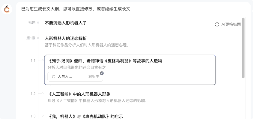- AI 生成的流程,符合创作者创作的过程,从大纲到正文。