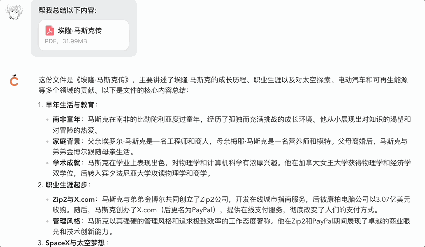 橙篇的「文档总结」功能也不错。当我上传 37.8 万字的、近 700 页的《马斯克传》,总结得简明扼要有细节,同样支持「去编辑」。