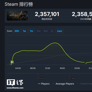 IT之家 8 月 21 日消息,国产 3A 游戏大作《黑神话:悟空》昨日全球同步上线,并迅速登顶多个平台的销量榜首。发售仅一小时,Steam 同时在线玩家人数便突破 100 万。