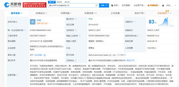 【CNMO科技消息】天眼查App显示,近日,赛力斯汽车销售有限公司企业名称变更为重庆问界汽车销售有限公司。该公司成立于2019年3月,法定代表人为刘威,注册资本5000万人民币,由赛力斯旗下重庆金康动力新能源有限公司全资持股。