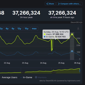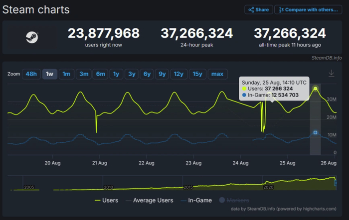 8 月 26 日消息,据 SteamDB 数据显示,全球最大的游戏平台 Steam 同时在线玩家数在昨晚(8 月 25 日)突破了 3700 万(37,266,324),再次创下新的纪录。