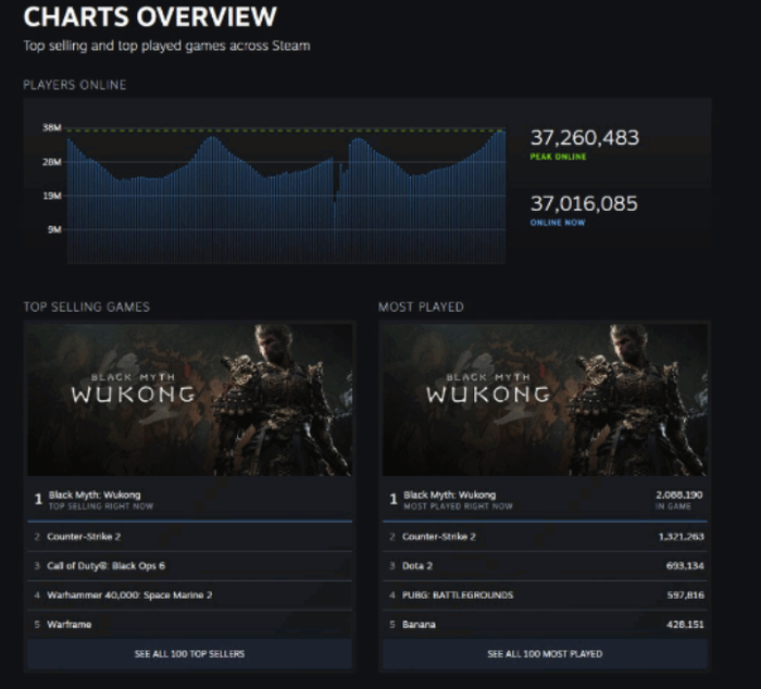Steam 同时在线玩家数突破 3700 万再创新高|《黑神话:悟空》在线人数位列第一
