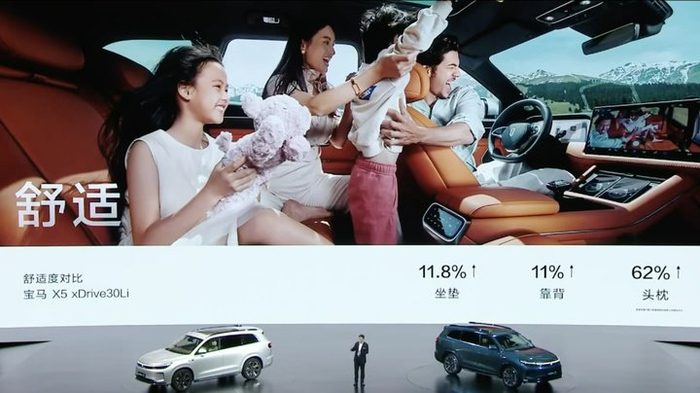 大五座车型的后排空间则有着较为明显的优势,纵向宽度达 1220mm,优于宝马 X5、奔驰 GLE 这些燃油车型,与理想 L7 处于同等水平。