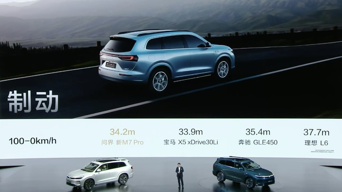 「我们车子有很大扭矩,动力性能很强,这没啥好说,电车这很容易做,但我们的制动距离还是很不容易的,那么大一个车重 2.3 吨、2.4 吨,我们百公里刹停只有 34.2 米,接近业界的优秀水平,」余承东总结道,即便是最入门的 Pro 版本,也能像 Ultra 版那样,比肩以性能和操控著称的豪华品怕 SUV。