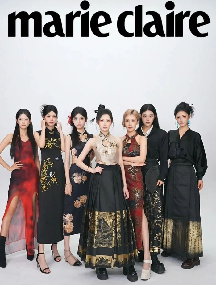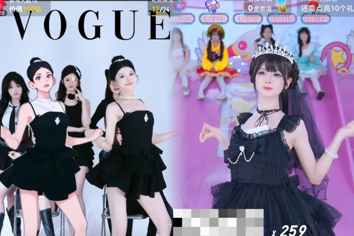更为巧妙的是,也有“聪明”的直播间选择使用K-Pop、J-Pop或是欧美歌曲作为跳舞BGM,“即便是放完全曲也难有跨海执法”。不仅如此,部分以杂志风格作为人设主题的直播间,也将《VOGUE》《marie claire》等时尚杂志Logo作为背景使用,同样也在涉嫌侵权的边缘游走。