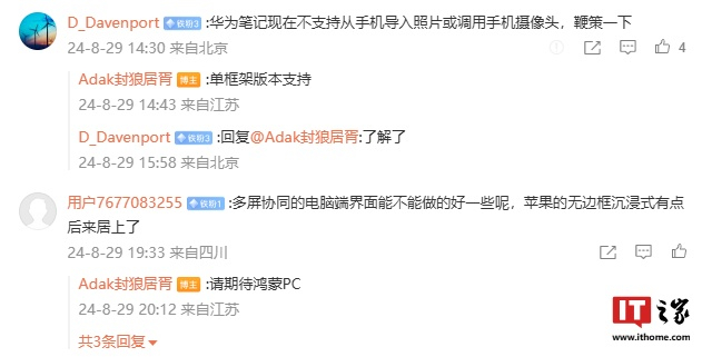 另外,博主针对评论区中网友的疑问进行解答,单框架版本将支持从手机导入照片或调用手机摄像头,更好的电脑端多屏协同界面需等待鸿蒙 PC。