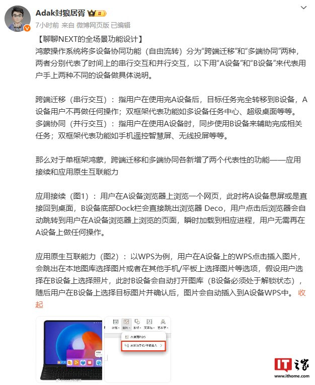 IT之家 8 月 29 日消息,博主 @Adak封狼居胥 今日发文透露了鸿蒙操作系统将多设备协同功能(自由流转)分为“跨端迁移”和“多端协同”两种。博主称: