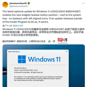 IT之家 8 月 30 日消息,消息源 @phantomofearth 昨日(8 月 29 日)在 X 平台发布推文,表示在 Windows 11 22H2/23H2 系统安装 KB5041587 更新之后,任务栏采用左对齐后,小部件面板的位置挪到了右侧,靠近系统托盘。