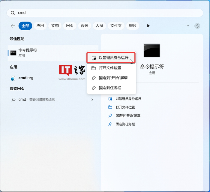 3. 按下 Win 键(或者使用鼠标)打开开始菜单,输入“cmd”,然后选择“以管理员权限”打开命令提示符。
