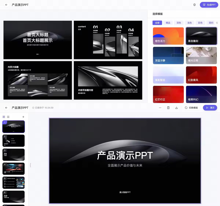 此外,PPT 创作支持文生图、图片素材库搜索匹配功能,基于通义万相视觉大模型实现。官方更称,“无论是工作汇报、学术演讲还是日常分享,首批上线的模版能满足不同场景下的需求。”