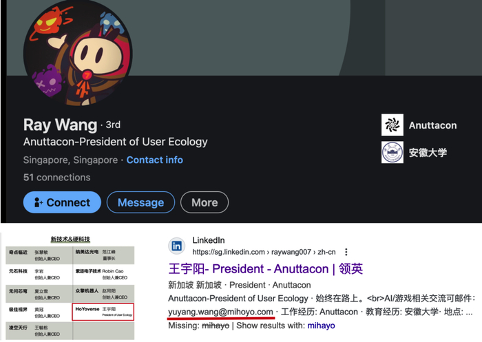 任 Anuttacon 用户生态总裁的 Ray Wang,也就是前B站游戏和直播负责人王宇阳,在离开B站后曾以 Hoyoverse 身份出席公开活动,也使用过米哈游企业邮箱(现已更换为个人邮箱)。
