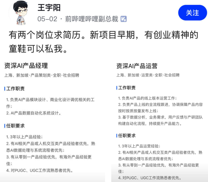 今年 5 月,他曾在脉脉上发布招聘“资深 AI 产品运营”和“资深 AI 产品经理”两个岗位,工作地点也包括新加坡。