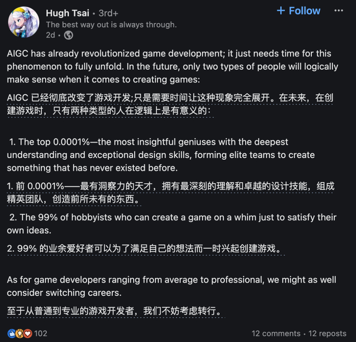 导火索 2:一向低调的米哈游创始人蔡浩宇,久违的公开发表“暴论”,用 AI 劝退游戏从业者。