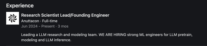他在 Anuttacon 任创始工程师、大模型研究团队负责人。