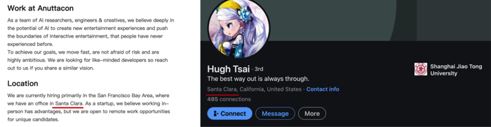 Anuttacon 招聘公告称主要在旧金山湾区招聘,但在圣克拉拉设有办事处,蔡浩宇领英账号上标注的最近地点也正是圣克拉拉。