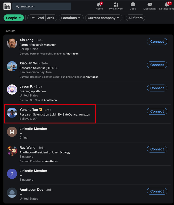Yunzhe Tao,本人领英页面显示一个月前刚刚加入一家“隐形创业公司”,但搜索 Anuttacon 的话他会与童欣、吴箫剑一起出现在结果之中。
