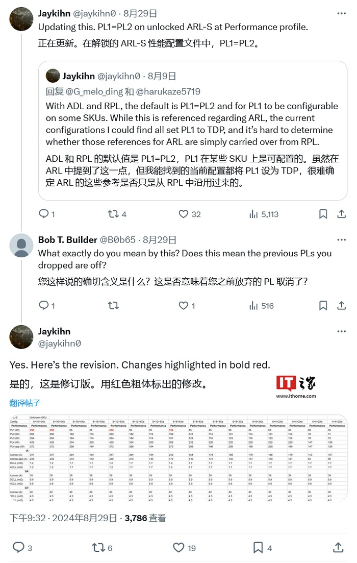 消息源 @Jaykihn 于 8 月 29 日发布推文,曝料英特尔将会在 4 个 SKU 中使用“性能”预设配置文件:
