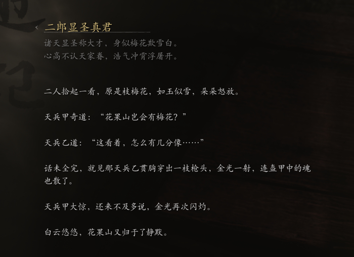 不过我们也可以看到,《黑神话:悟空》用寥寥数笔,便将二郎神对悟空感情刻画得入木三分,游戏文案对白月光的理解、对“替身文学”的拿捏,以及对互联网时代造梗需求的调动,都颇见功底。