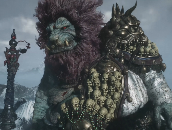 如果我们在让想象力更天马行空一些——说来在游戏里,当这二郎显圣真君在与天命人的法天象地之战中,化作了青脸獠牙的狮子形象,此时如果你仔细观察他的建模,会发现这青面狮子身上缠绕着大量头骨: