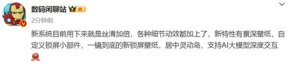 关于ColorOS 15,数码闲聊站表示:“新系统目前用下来就是丝滑加倍,各种细节动效都加上了,新特性有景深壁纸,自定义锁屏小部件,一镜到底的新锁屏壁纸,居中灵动岛,支持AI大模型深度交互。”